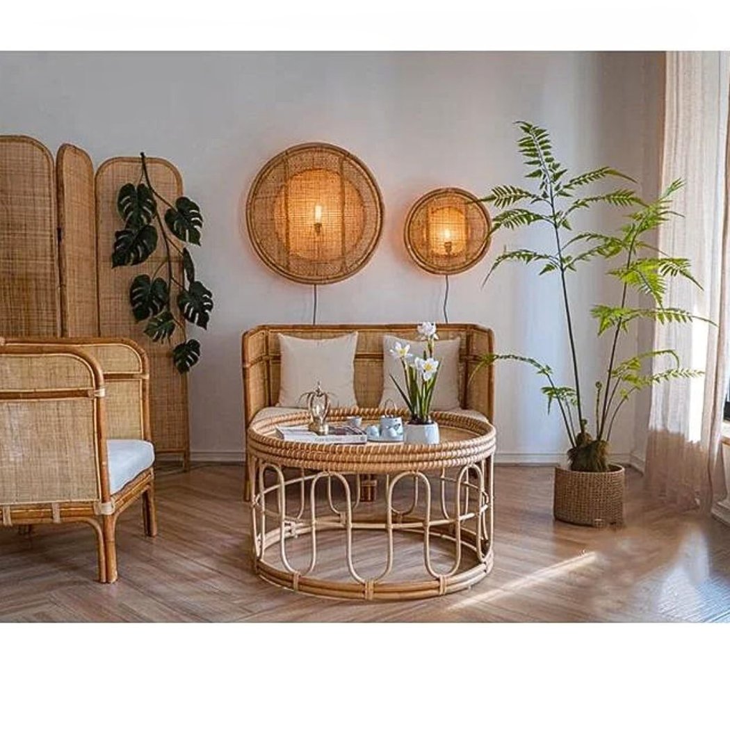 Lo chic bohémien è sotto i riflettori con questa applique in canna. Realizzata con materiali naturali come il rattan per la canna e il bambù per la circonferenza dell'applique, incarna l'autenticità e il calore dello stile bohémien.